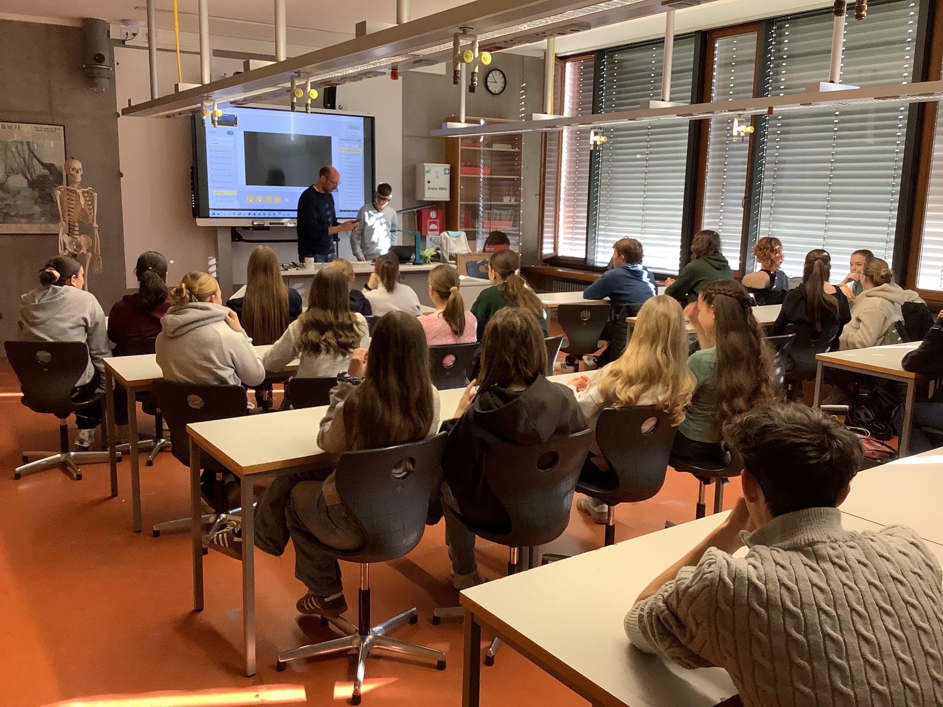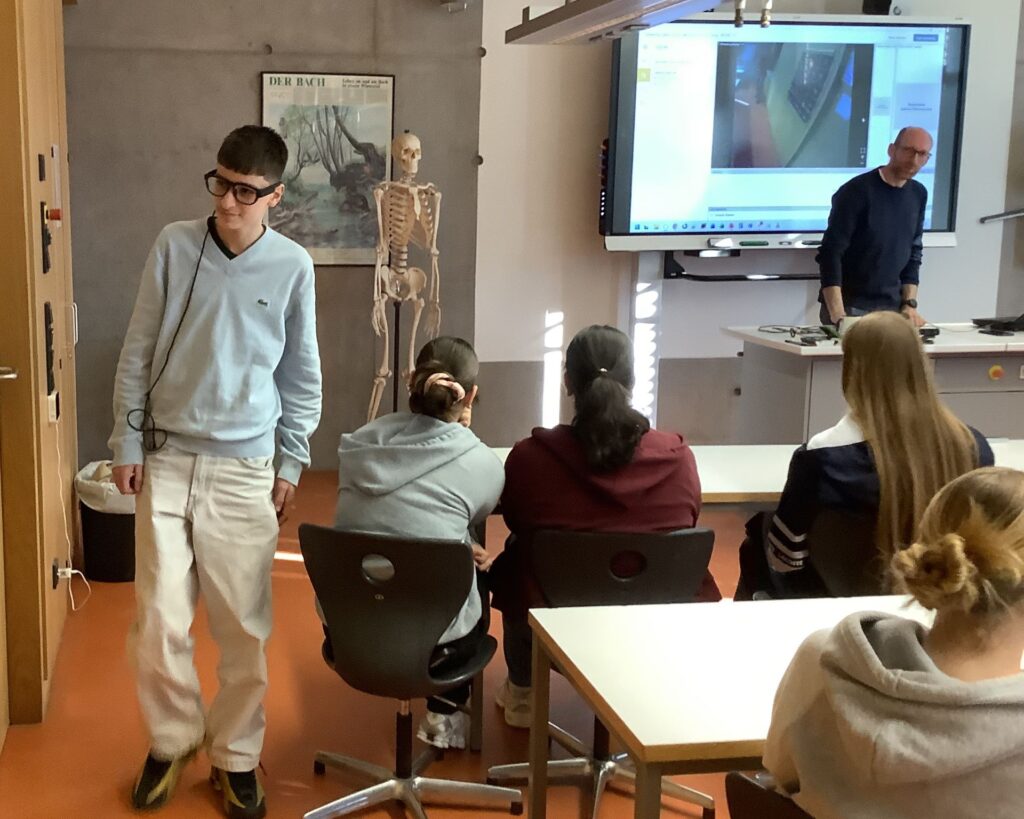 Wir hatten am Donnerstag, 19.3., Besuch von einem ehemaligen Schüler des AMG (Abi 1999), jetzt Vertriebschef der dänischen Neurofirma iMotions in Berlin, welcher der 9b & dem Bio-Lk in einer Doppelstunde von seinem Werdegang erzählte. Mit moderner Gesichtserkennungs- und eye-Tracking-Technologie werden Augenbewegungen sowie Emotionen unter anderem für Werbezwecke ermittelt. Auch der Geheimdienst ist Kunde der Firma. Die eye-Tracking-Brille durften die SuS im Schulhaus ausprobieren.